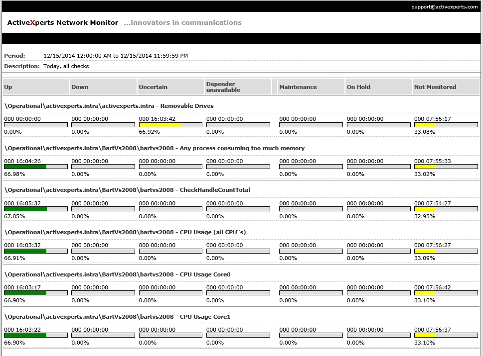 Anti-Virus / Internet Security - Citrix ICA - Citrix XenApp - CPU Usage - Directory - Disk Drives - Disk Space - Event Log - File - Memory Usage - MSMQ - MS Terminal Server - Performance Counters - PowerShell - Printer - Process - Registry - Remote Command - Removable Drives - Scheduled Task - Service - VBScript - Windows Defender
